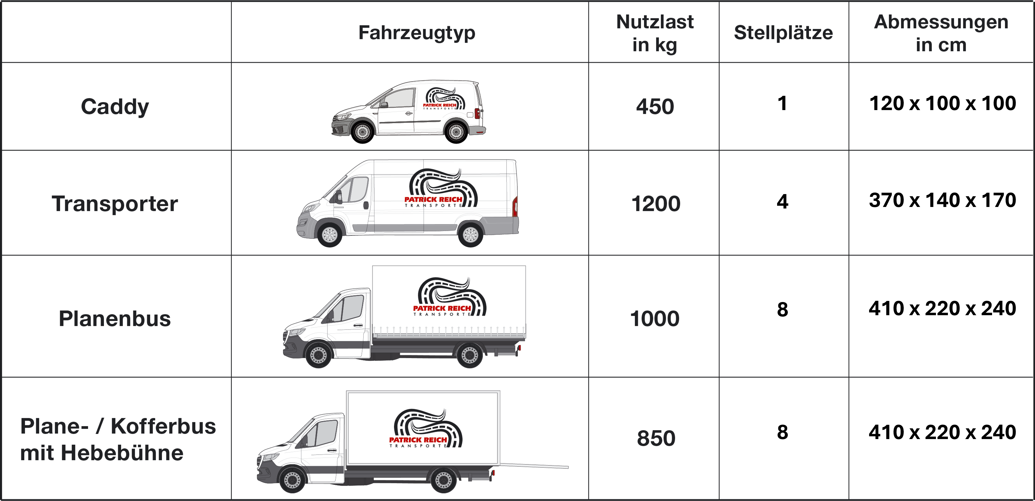 Dank unserem breit aufgestellten Fuhrpark können wir Ihnen für jedes Transportvorhaben das ideale Fahrzeug bereitstellen. Gerne finden wir gemeinsam mit Ihnen im persönlichen oder telefonischen Gespräch heraus, welche Anforderungen und Herausforderunen Ihr Vorhaben mit sich bringt.
